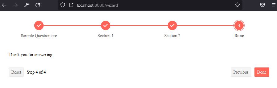 The POST request to the /wizard resource is handled by the wizardSubmit method. Spring is kind enough to map the Form data received to the Questionaire class. When a POST request is received, this prints the questionaire contents to the console and responds with an HTTP OK.