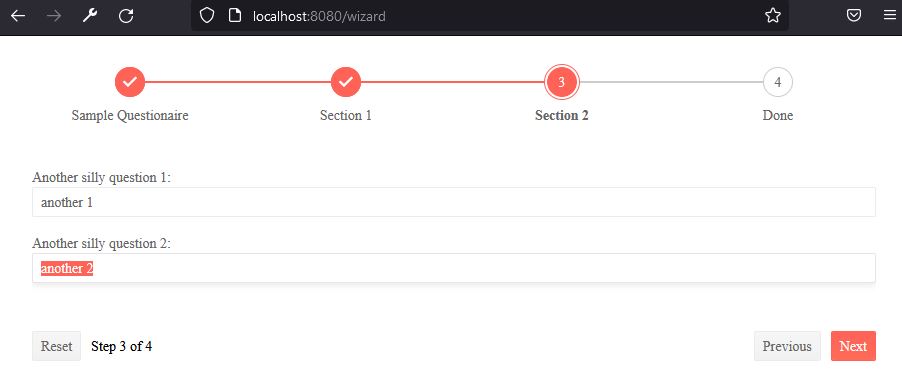 Questionaire [section1answer1=silly 1, section1answer2=silly 2, section2answer1=another 1, section2answer2=another 2]