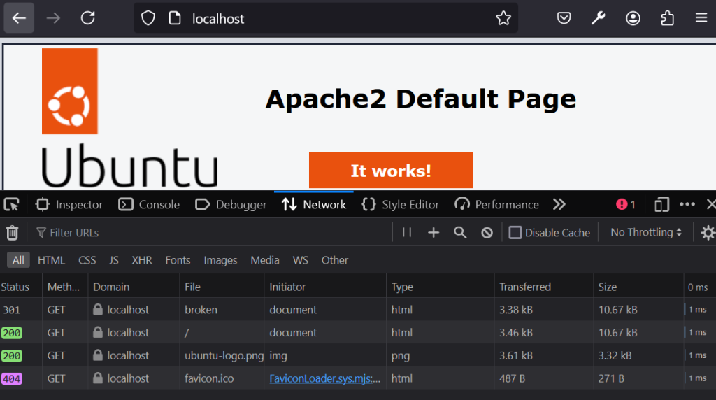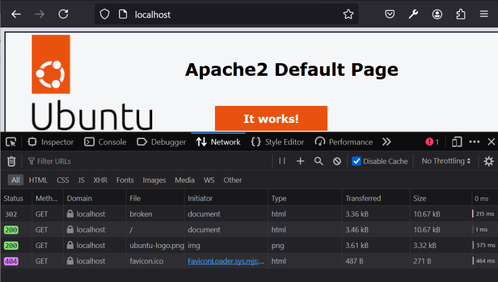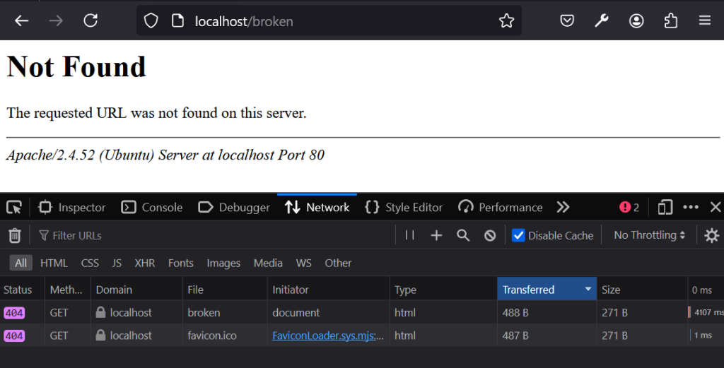 </VirtualHost>Restart Apache, sudo service apache2 restart. Open your browser and disable cache in your network tab before hitting http://localhost/broken. You should have something like below.