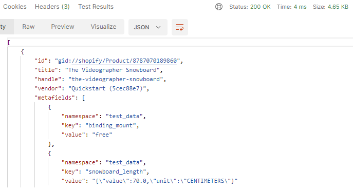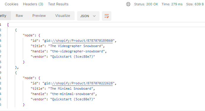 {"id":"gid:\/\/shopify\/Product\/8787070386468","title":"The Archived Snowboard","handle":"the-archived-snowboard","vendor":"Snowboard Vendor","productType":"","tags":["Archived","Premium","Snow","Snowboard","Sport","Winter"]}Running the Shopify Bulk Query Example