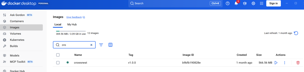The above command builds the crowsnest image with the image identifier (i.e tag) crowsnest:v1.0.0 on the current path. I sometimes add the option --no-cache to not use cache when building the image. After a successful build, you should have something like below. Old school way is docker images on the CLI (Command Line Interface).