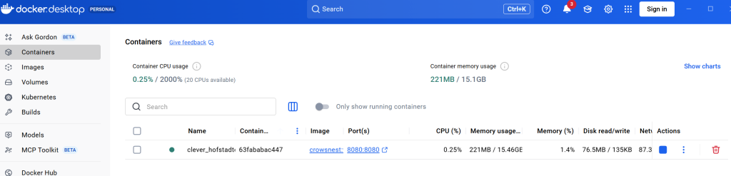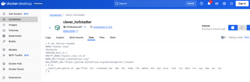You can start/stop the image from running via the Actions button. Chances are you might experience some connectivity problems. Can’t connect to an API or database. Click on the three dots then “Open in terminal”. This should give you a shell prompt like below. As you can see, we are running Alpine Linux. Remember FROM eclipse-temurin:17-jdk-alpine? On the root directory is app-files and crowsnest.jar. Built with the following commands COPY docker-files/ app-files and COPY ${JAR_FILE} crowsnest.jar. Here, you can try ping, curl, wget, telnet, etc. to check connectivity. Excellent!