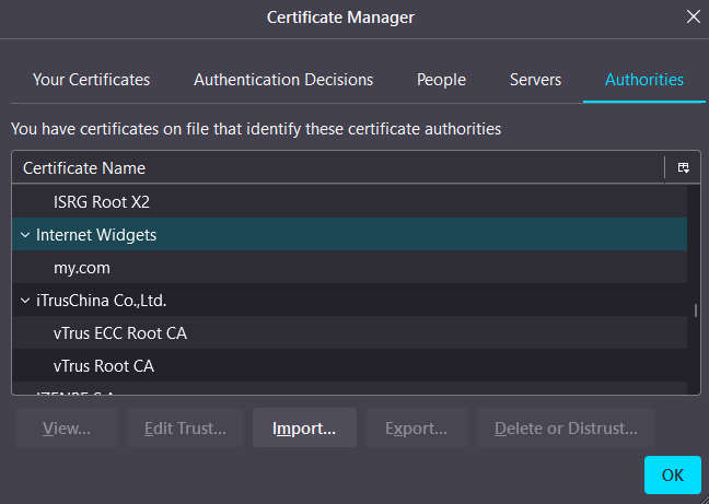 Import myCA.crt and trust it to identify websites. You should be able to see Internet Widgets installed.