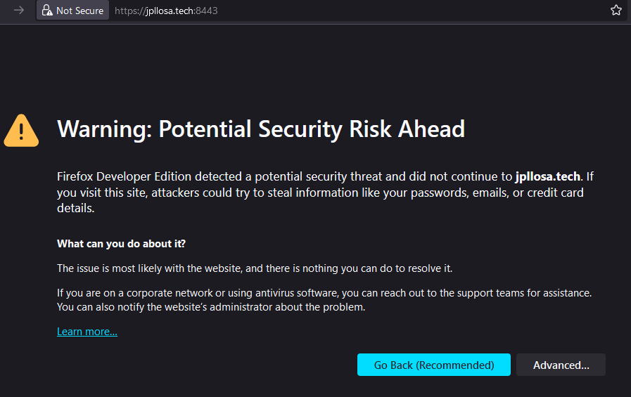 Place jpllosa.tech.crt and jpllosa.tech.key under /src/main/resources so it can be picked up in the classpath. Try running the web app and go to the site. What do you see? Do you see something like below?