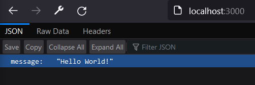 Pretty simple program. An HTTP GET request triggers a response of “Hello World!” in JSON format. The server is listening on port 3000.