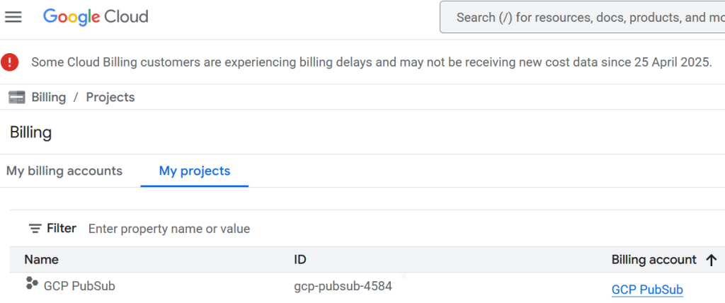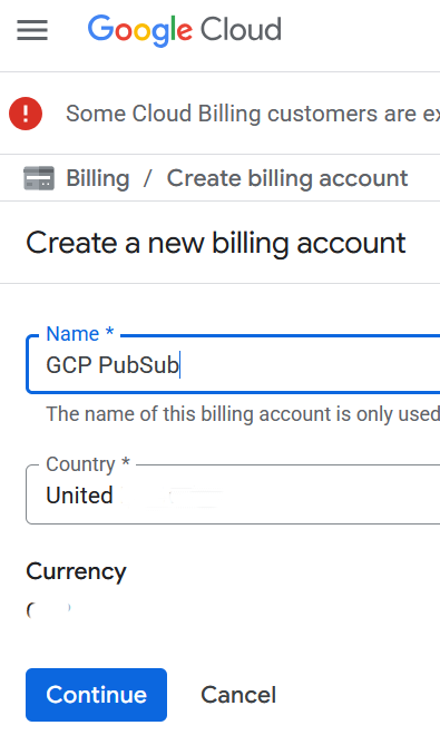 Assign your new project with billing. As of this writing, Google provides free credits to new customers and free usage limits. For Google PubSub, it is 10 GB of messages per month. Please verify for yourselves if this is still the case. Here’s what creating a billing account looks like and it being connected to the project ID.