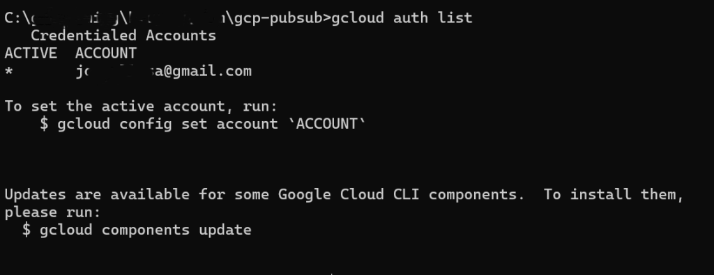Install and initialize the Google Cloud SDK. For installing the Google Cloud SDK Shell, it is better to get it from the horses’ mouth. Please follow the Google Cloud documentation on how to install and initialiaze it for your project. Once initialized, enable GCP PubSub. Here are a few checkpoints so you’ll know you are heading in the right direction. First and foremost, you must log in with application default credentials using the following command, gcloud auth application-default login. When you are logged, you should have something like below.
