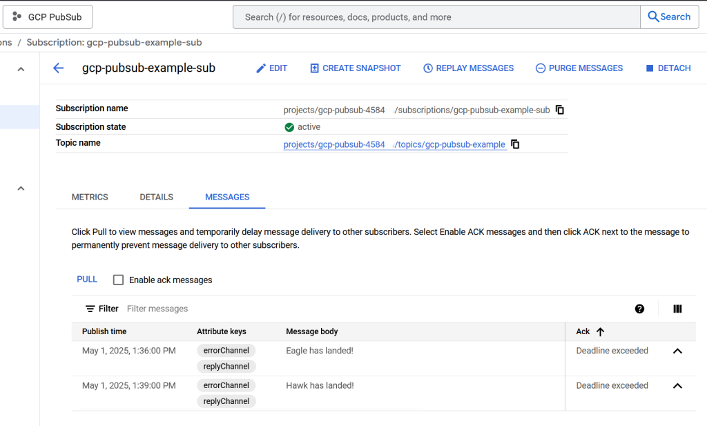 Now, head over to GCP PubSub messages section and we should see the messages appear. If not, try reloading the web page or do a PULL. It should look like below.