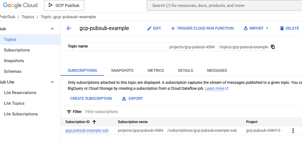 }Since this is a blog about GCP PubSub, I’ll focus on explaining the code related to it. I won’t be talking about the other annotations (e.g. @SpringBootApplication, @PostMapping, etc.). For example, @PostMapping is related to web and nothing to do with GCP PubSub. We just need that endpoint to trigger a send message to GCP PubSub. We can use other client libraries to communicate with GCP PubSub, not just Spring.
