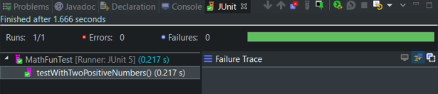 We trust Euclid’s algorithm so we don’t need to refator the code. This example is not about finding the GCF anyway but an exercise on TDD. The next thing would be to think of another test case that we can exercise on our getGCF method. Let’s add another test, testWithZero, to test with a zero input. Run the test again. You should have two passing tests.